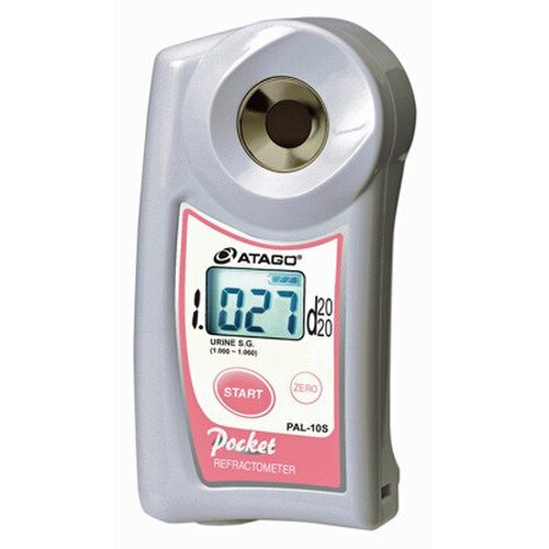 The PAL-10S is a digital hand-held compact refractometer to measure urine S.G. To operate it, simply place a drop of urine on the prism top and press the "Start" key. Then, the urine S.G. value will be displayed on the LCD instantly.
