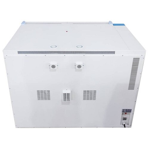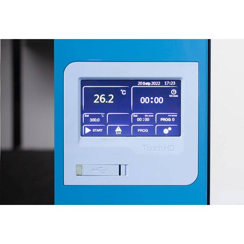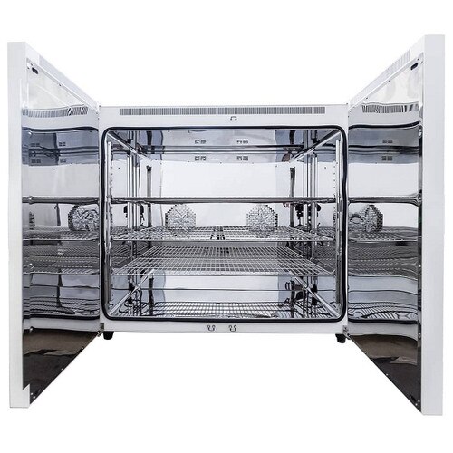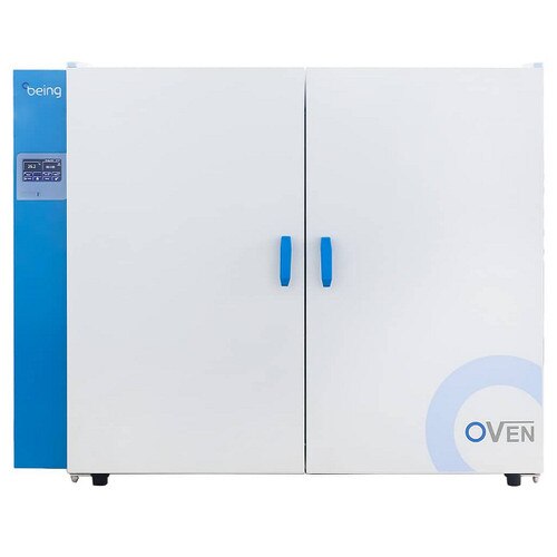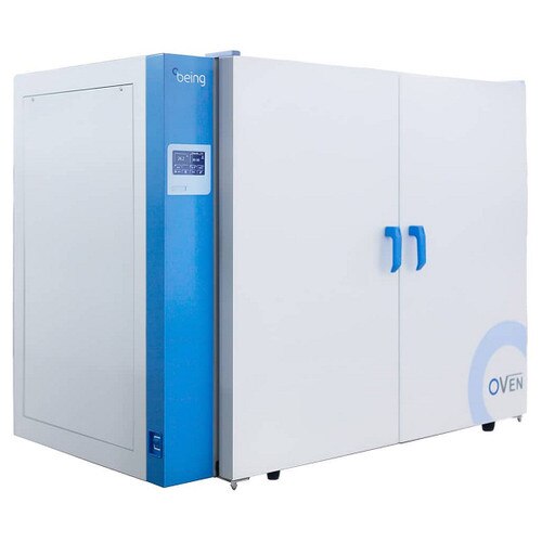 BEING BOF-400T, 400L Forced-air Convection Drying Oven has a touchscreen PID controller with USB data collection, two adjustable exhaust vents, height-adjustable anti-spill shelves, and 3 fan speeds. Temperature rating: Ambient + 300C; Timer: 1 min. to 99 hrs. 59 min.; 220VAC