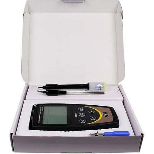 What's Included: EC 100 portable conductivity meter, plastic conductivity electrode, temperature probe, and three AA batteries.