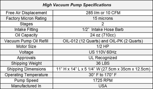 These 10 CFM (285 l/m) rotary style, 2 stage direct drive pumps are ideal for use in virtually all high vacuum applications. Pumps are tested to 15 microns Hg but are suitable for all applications requiring a vacuum under 500 microns Hg. The pumps use High Vacuum Pump Oil (one quart included) and are designed to run on a closed and dry system. Regular oil changes and proper maintenance will ensure these pumps will last for years in your laboratory.