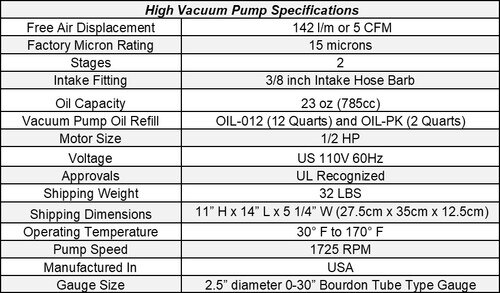 High Vacuum Pump, 5CFM, 110V, 60Hz with 0-30" Bourdon Tube Type Gauge
