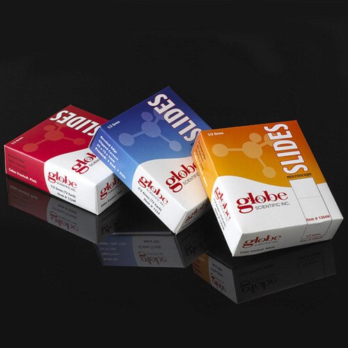 Globe's frosted microscope slides are produced using a unique chemical etching process. This provides our slides with a smooth frosted finish that won't wear out slide marking pens. Slides are printed with "Globe" under the frosting area for orientation purposes. Finding the perfect slide to suit your needs is easy: choose from single sided or double sided frosted, and ground or beveled edges. We also offer our ground-edge slides with the following options: 90° corners (straight-edge) or safety corners.
