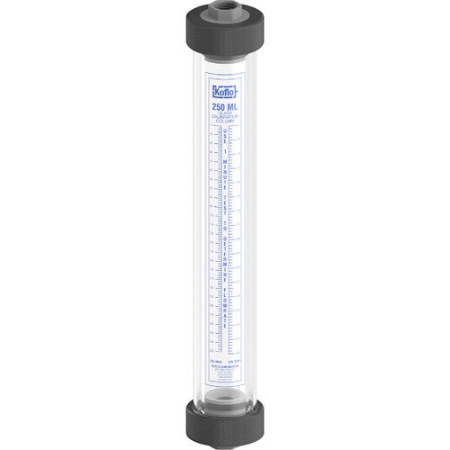 Koflo pump calibration columns (also known as calibration cylinders) provide a simple method for determining pump flowrate using industry-standard graduations of milliliters/minute and gallons/hour. All columns feature top-aligned graduated scales that allow the operator to survey both ml/min and GPH in a single, one-minute test. High-contrast blue lettering enhances readability in all light conditions, and all scales have a protective lamination layer to protect against chemical attack.