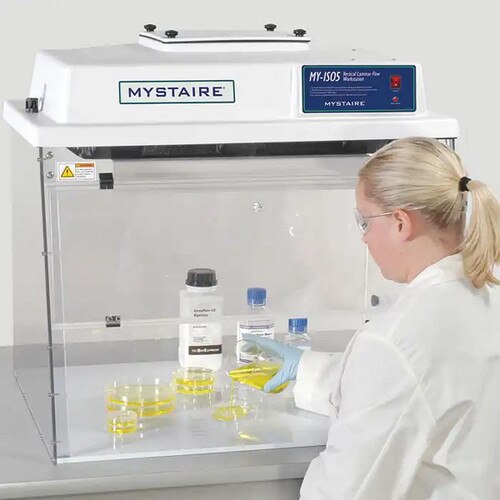 The Mystaire MY-VLF32 offers the same ISO 5 performance and compact footprint as the MY-VLF24, but with a wider internal workspace to accommodate larger instruments or more complex workflows. Designed for benchtop use, this model is ideal for labs needing a personal clean zone with extra elbow room. Its durable polypropylene and polycarbonate construction ensures long-term resistance to harsh disinfectants, while the automatic sash interlock simplifies operation and conserves energy.
