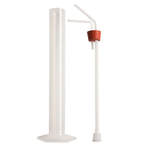 Graduated 250ml polypropylene cylinder with a stable extended base for use in precipitating elements from gas. Gas is dispersed through a removable fitting that has a coarse grade porosity, polyethylene dispersion disc. The silicone stopper holds 6.3mm (1/4") O.D. tubes for entrance and exit of gas. 0.5 psi maximum pressure.