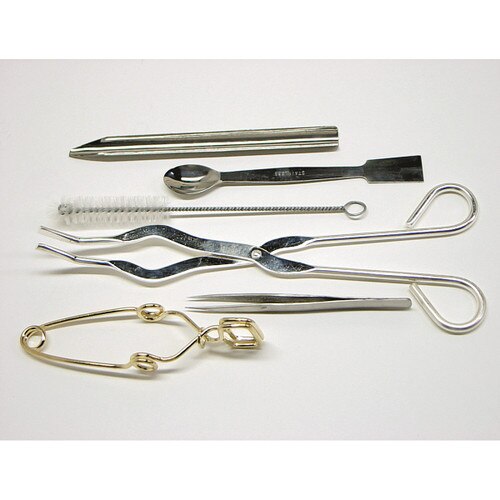 A nice assortment of most commonly used lab tools, available as one convenient set. Contains one each of following: test tube brush, spatula, crucible tongs, test tube clamp, lab scoop, forceps.