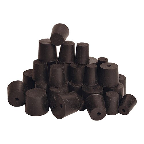 These black stoppers are made of solid natural rubber that stays pliable over a long period of time. Ideal for use with non-aggressive or concentrated solutions. Low sulfur content. Withstands temperatures from –25 to 70°C (–13 to 158°F). Available in solid, one-hole, and two-hole versions. Each stopper has its size marked in raised figures. Sold as one-pound bags.