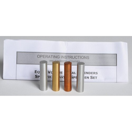 Cylinder specimen set is used for density and specific gravity studies. Set of four includes aluminum, copper, steel, and brass cylinders. Includes a storage box and activity guide.