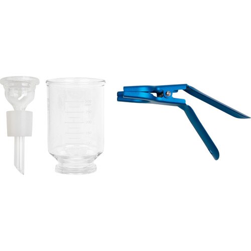 Includes: | Anodized Aluminum Clamp, Funnel, Glass Support Base (Fritted) and Silicone Stopper |